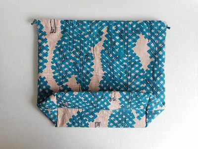 編み途中の針にかかった編み地や糸、編み物用品を入れて持ち運びに便利な巾着タイプのバッグ。内側のホック付きの方は編み地と糸玉の間の糸を通して使うと便利です。編み物以外にも、小物をまとめてバッグインバッグにー。