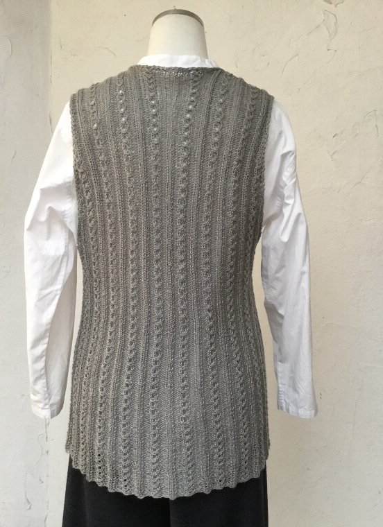カットソー、シャツ一枚に色を添えるように透け感のあるGILET(ジレ)をまとう。編みっぱなしのような前開きが外巻きにカールする感じ、ロング丈のスリットがなびくところが涼しげです。
