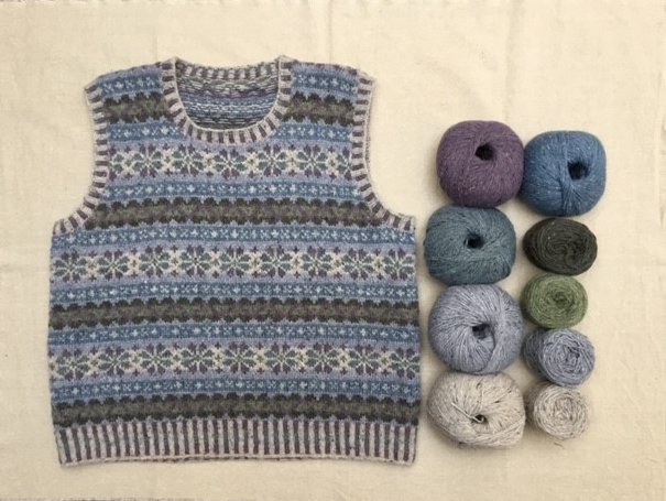 フェアアイルレッスンのスターターキット用の小さなパターン、花とハート(花びら)模様を生かしたベスト。パターンも配色も編みやすくデザインされているので、どなたにも、いつまでも着れるベスト”としてお勧めします。