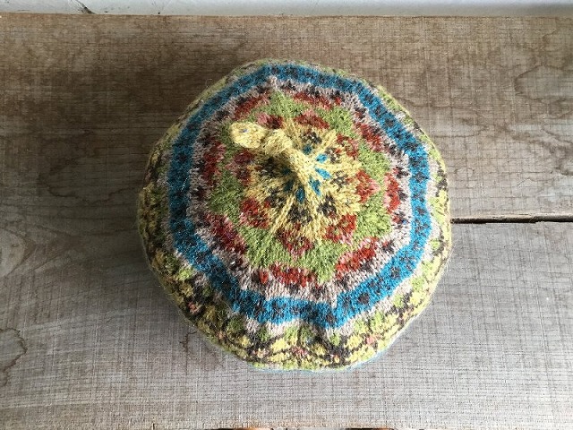 フェアアイルレッスンのスターターキット用の小さなパターン、花とハート(花びら)模様を生かしたベスト。パターンも配色も編みやすくデザインされているので、どなたにも、いつまでも着れるベスト”としてお勧めします。
